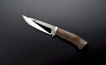 This knife is a practicable sheath knife. The shape of our blade is made from a consecutive convex surface. This is a technology that doesn't permit other follows, and we have confidence in this surface. When you strongly press this knife against the telephone book, it will cut like cutting butter. Please confirm our HONZUKURI blades that evolved. ZDP189 is a powder stainless steel material developed for cutlery. It is a product of the nano tech. Sharpness did not decrease so much to the blade of ZDP189 after having cut hard Manila rope 780 times. However, it is an unsuitable knife to the beating cut. This knife is full tang.